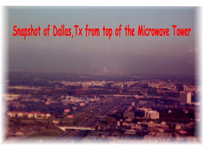 Keith took this picture of Dallas (in the far background) from the top platform of the tower after he installed the strobe light which must function at all times for aircraft warning. Should the strobe light burn out, an alarm goes off. Keith had to climb the tower and change out the bulb. |