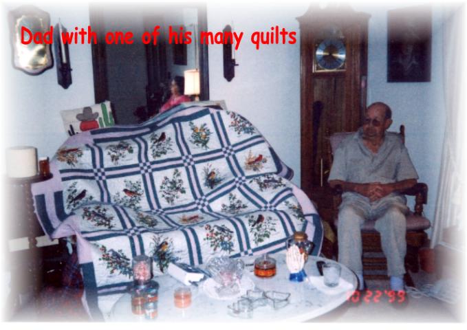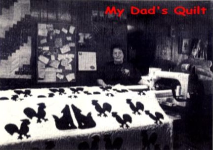 Weddington Quilts Unusual Designs Wanda Weddington of rural route Cassville reports that she has quilted 1,000 quilts since July of 1997 when her business began. The unusual quilt above belongs to George of Aurora, George appliques the silhouettes then brings the quilts to Weddington to be machine quilted. She has quilted around 200 for him since 1999 when he first began bringing them to her. Weddington says it takes about three hours to do a double size quilt. The coyotes pictured in the middle, with roosters turned towards them signifies one of George's hobbies. Another quilt was waiting to be put into the frames as Weddington finished the coyote quilt. George designed from wall hangings in his home. |